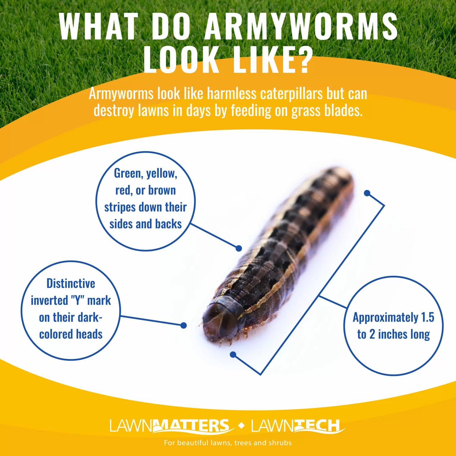 In the larval stage, armyworms are about 1 1/2 to 2 inches long, have a distinctive inverted “Y” mark on their dark-colored heads, and have green, yellow, red, or brown stripes down their sides and backs. Adult armyworm moths measure about 1 1/2 inches across. Their front wings are dark gray with light and dark splotches, and they have pale gray-white hind wings.