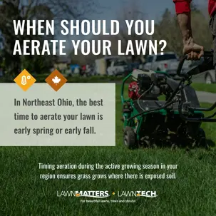 Because we have cool season grasses in Northeast Ohio, the best time to aerate your lawn is early spring or early fall. Timing aeration during the active growing season in your region ensures grass grows where the soil has been exposed.